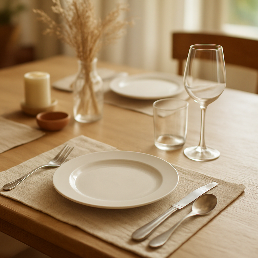Évite d'accumuler 6 couverts si ton menu est simple. Une table chic est souvent une table épurée. Pour un dîner "effet wow" sans surcharge : fourchette + couteau + éventuellement cuillère à dessert, c'est déjà très élégant.